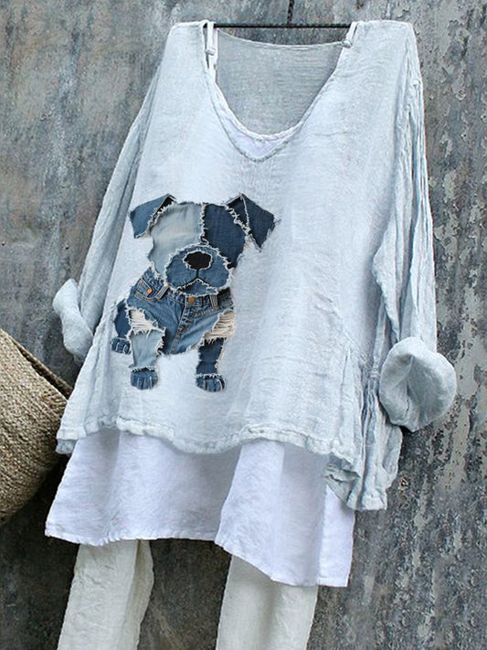 Women's Cute Cat Patchwork Art Linen Shirt